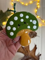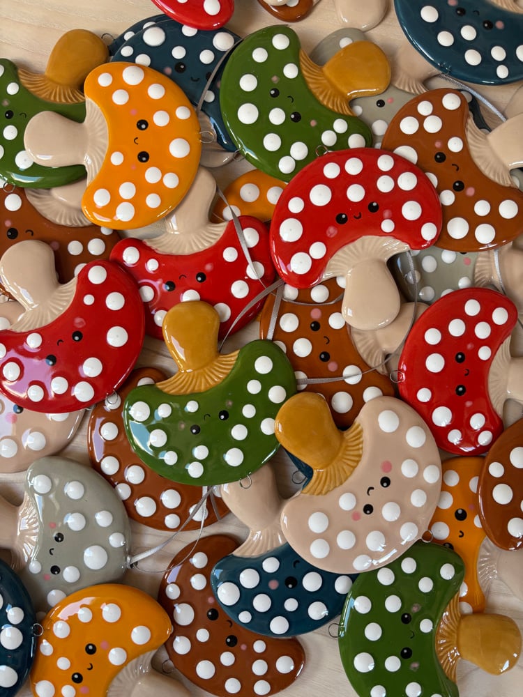 Each piece is carefully sculpted, glazed, and kiln-fired, making every decoration unique. Hung on a ribbon, it’s ready to add a playful touch to your seasonal displays, Christmas tree, or as a year-round hanging accent for mushroom and nature lovers alike.