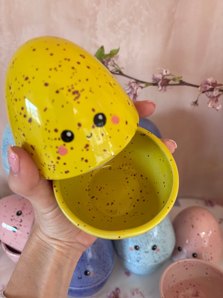 Lift the lid and you’ll find a hidden space inside, perfect for storing small treats, jewellery, or your own stash of mini eggs (highly recommended). It’s equal parts decorative and functional — a tiny treasure keeper disguised as a cheerful egg.